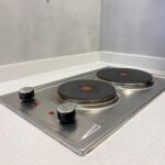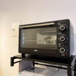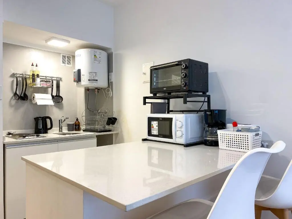 La cocina abierta con barra y dos sillas está equipada con heladera, horno, utensilios y todo lo que necesitás para cocinar en casa si así lo preferís.